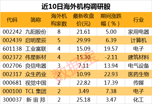 海外机构调研榜单中,九阳股份参与调研的海外机构达到8家,最受关注;其次是启明星辰,参与调研的海外机构共有5家。