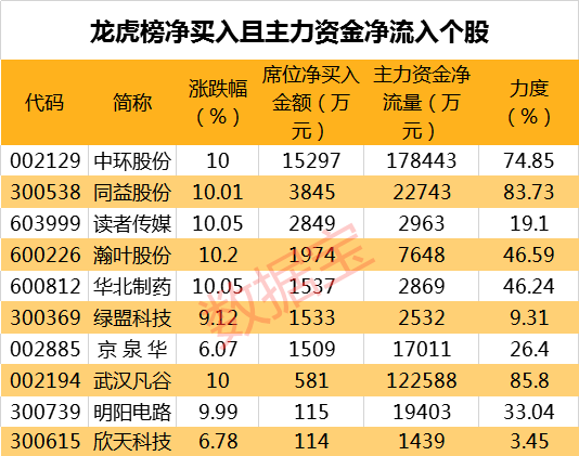 从盘口资金流向来看,主力资金净流入超千万且龙虎榜净买入个股共有10只,其中中环股份、武汉凡谷、同益股份等个股资金净流入金额最大。净流入力度最大的个股有武汉凡谷、同益股份、中环股份,净流入力度分别为85.8%、83.73%、74.85%。