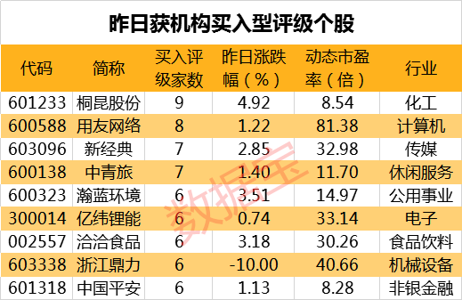 昨日机构研报共发布254条买入型评级记录,共涉及128只个股。桐昆股份关注度最高,共获9次机构买入型评级记录。
