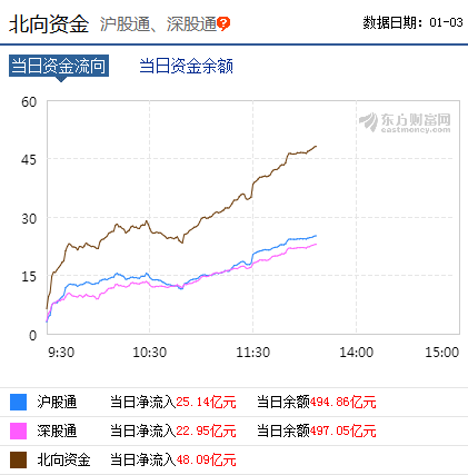 开年以来,北向资金继续大买模式,新年首日净流入超过100亿元,自沪深港通开通以来,累计净流入金额突破万亿元。今日北向资金延续净流入,截至发稿净流入48.09亿元。