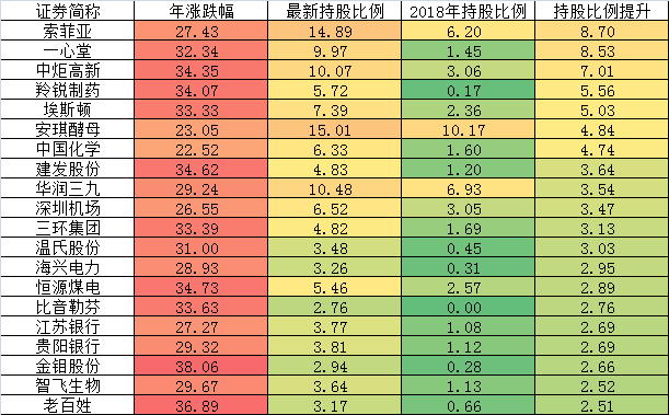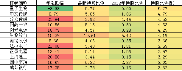 索菲亚、一心堂、洽洽食品、阳光照明、汇川技术、东方雨虹、益丰药房、光环新网、广联达、国瓷材料、中炬高新、迪 安诊断、泰格医药、格力电器、中联重科、启明星辰、中顺洁柔、康缘药业、恒立液压、量子生物、羚锐制药、杰瑞股份 、海尔智家、平安银行、红旗连锁、旗滨集团、中航光电、华宇软件、埃斯顿、新国都等持股比例绝对值提升超过5%。其 中,量子生物、新国都都是外资2019年新进的个股。