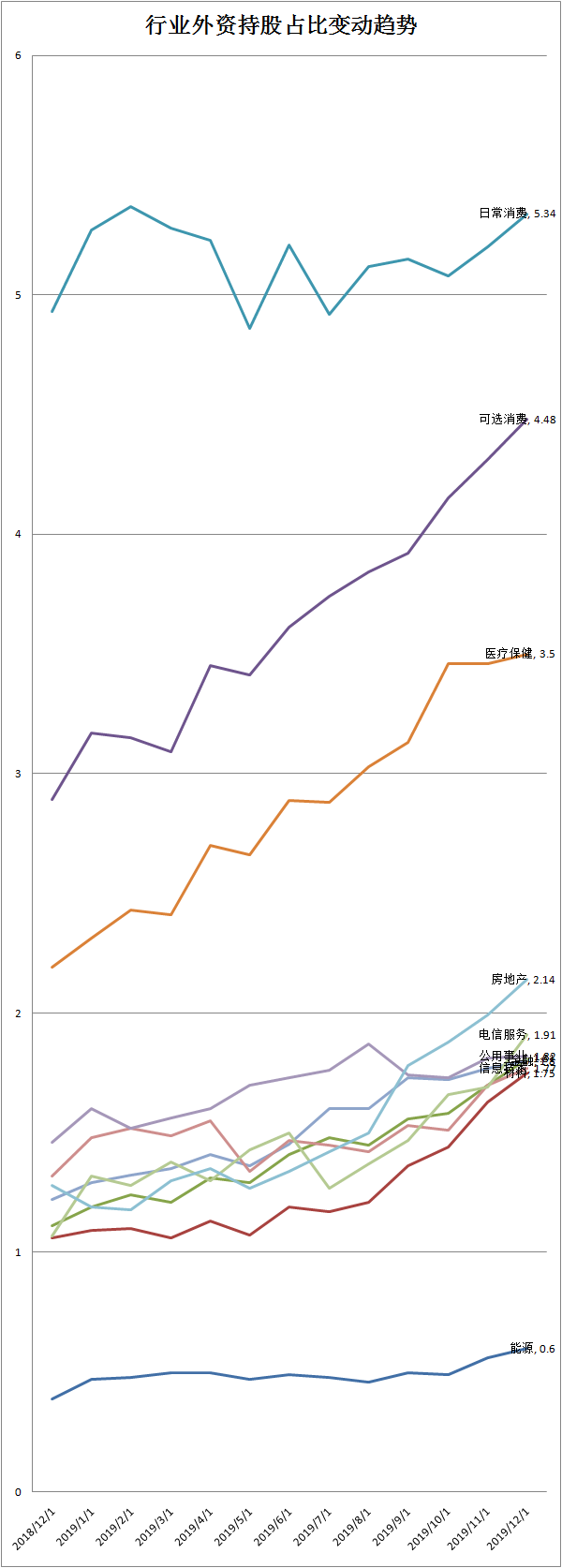 数据显示,目前两市共1433只个股被外资持有。从行业来看,外资最新持股占比最高的行业分别为日常消费、可选消费、医疗保健、房地产、电信服务。