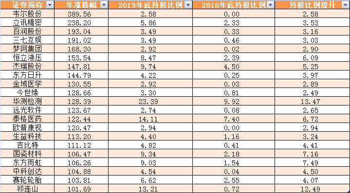 外资增持前100名名单里共产生21只涨幅超过100%的个股,韦尔股份涨幅最大,年度涨幅389.56%,立讯精密涨幅238.20%, 百润股份、三七互娱、梦网集团、恒立液压涨幅超过150%。