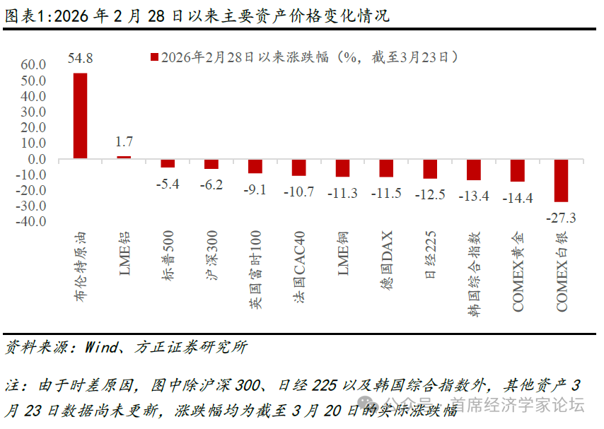 各类资产价格之所以受到如此显著的影响,核心原因在于油价大涨导致的双重预期:一方面,市场普遍担忧油价暴涨会加剧全球经济增长放缓的风险,甚至可能引发衰退;另一方面,油价大涨推升全球通胀预期,这或将直接导致以美联储为代表的主要央行降息节奏趋缓,甚至不排除重启加息的可能。