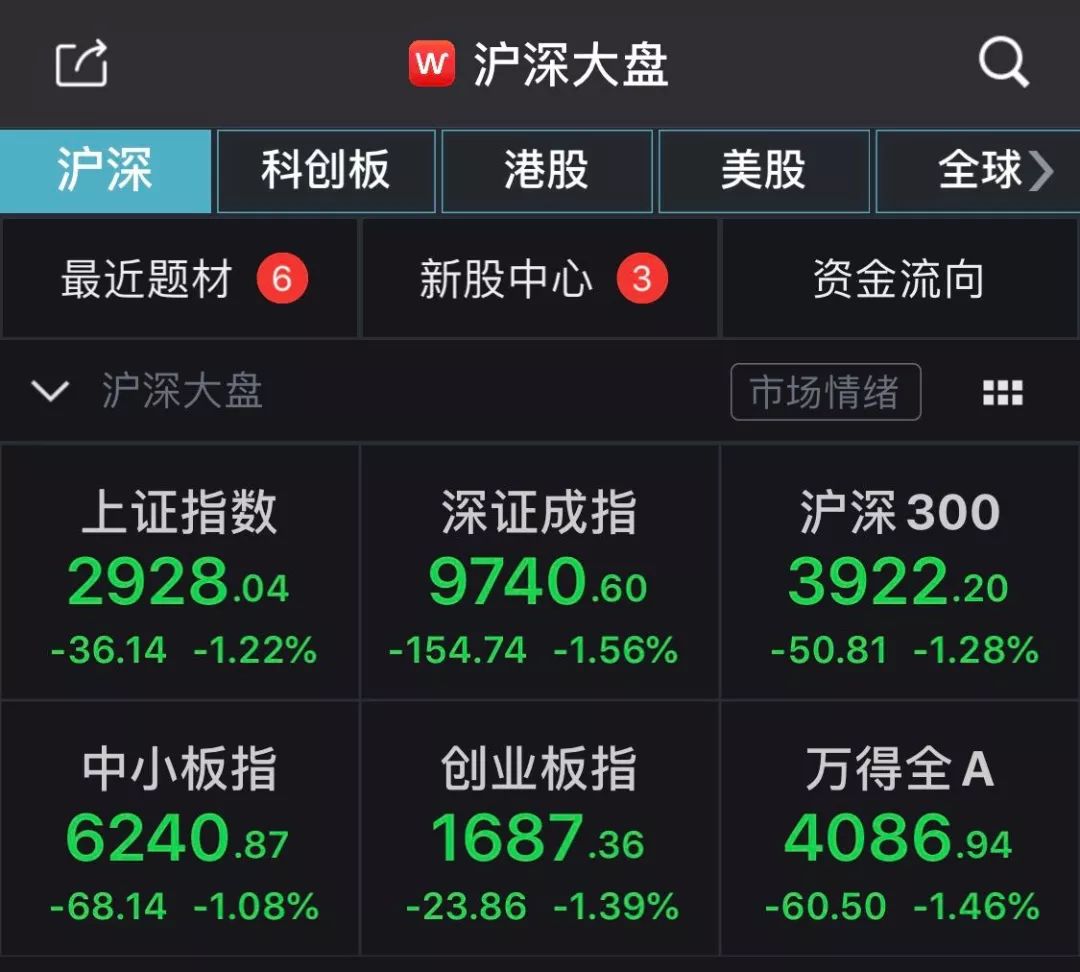 A股的这个“双十一”过的确实不太如意。截至午间收盘,沪深主要指数均出现了较大的跌幅,上证指数下跌1.22%,报2928.04点;深成指下跌1.56%,报9740.60点;万得全A指数早盘下跌1.46%,市值蒸发9067亿元。