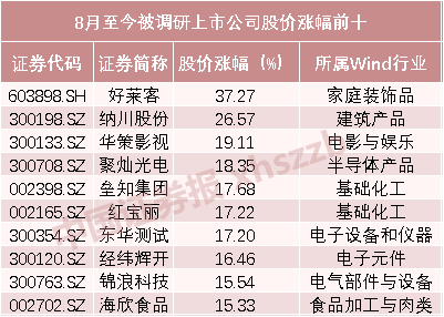 从二级市场表现看,截至8月17日收盘,8月以来被券商调研的60家上市公司中有37家股价上涨,涨幅最大的好莱客累计涨幅达37.27%,纳川股份累计涨幅达26.57%。华策影视、聚灿光电、垒知集团、红宝丽、东华测试等18只个股涨幅超10%。
