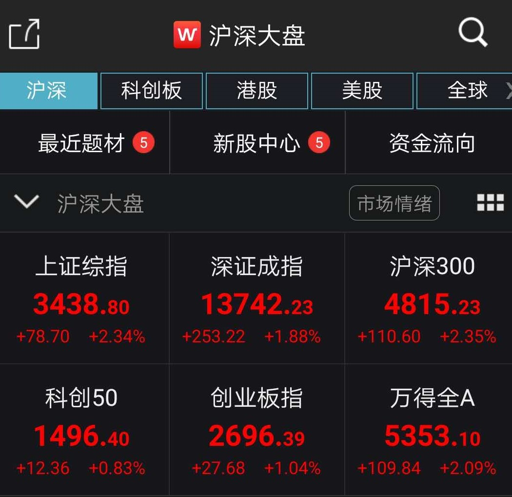 Wind数据显示,今日A股市场全线高开,沪指单日大涨逾2%,强势站上3400点关口。截至收盘,沪指、深指、创业板指分别上涨2.34%、1.88%、1.04%,两市近3400只个股上涨,成交额再度突破1万亿元大关,为1.15万亿元。