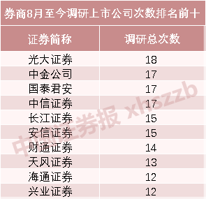 光大证券是8月最为活跃的券商,截至8月17日累计调研上市公司18家次;中金公司、国泰君安、中信证券8月以来调研上市公司次数均为17家次;长江证券、安信证券、财通证券、天风证券、海通证券等15家券商均在10家次以上。