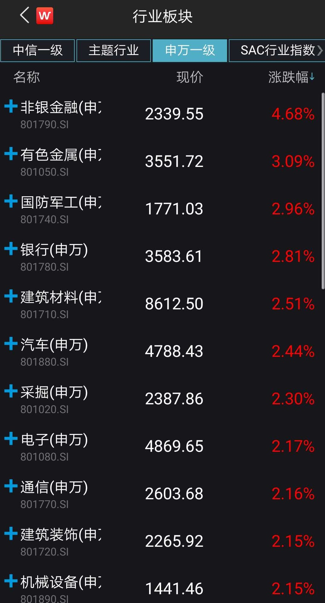 从板块看,今日市场行情最大助力莫过于“金融三剑客”银行、保险、券商。Wind数据显示,28个申万一级行业中,非银金融以4.68%涨幅领涨,成分股中,保险、券商大面积飘红,招商证券、国联证券涨停,中国人寿连续2日涨停。银行以2.81%涨幅居前,成都银行再度涨停。