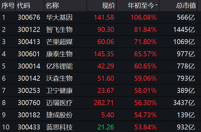 截至6月15日,创业板50指数成份股当中,多只股票涨幅惊人。其中,华大基因股价报收141.58元,今年以来已经累计上涨106.08%,翻了一倍多。智飞生物则以涨幅81.84%,紧随其后;芒果超媒今年以来涨幅则达71.80%。
