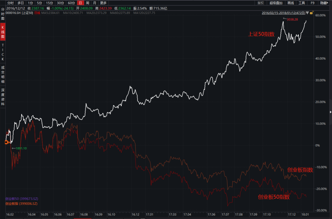 在2016年初到2018年年初,那是属于上证50指数的”漂亮50“时代!一批以贵州茅台、格力电器为代表的大盘股业绩屡创新高,而一大批中小市值的股票却是一路跌跌跌,形成了鲜明的对比。一时间,“漂亮50”和“要你命3000”两个词一下火遍了投资圈。以价值股为代表的上证50指数,也是那三年里走势最强的指数。