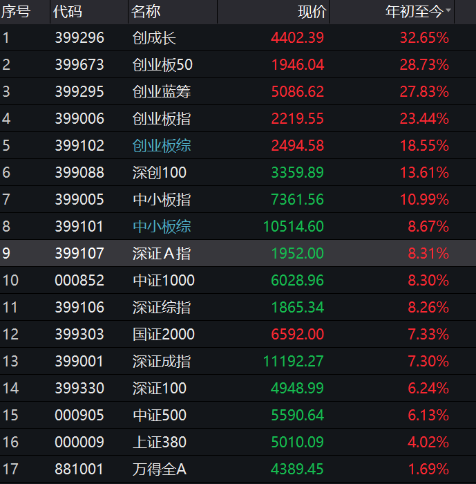 今年以来,创业板指数涨幅遥遥领先。其中,创成长指数涨幅达到了32.65%,创业板50指数累计上涨28.73%,创业板指数年内累计上涨23.44%。
