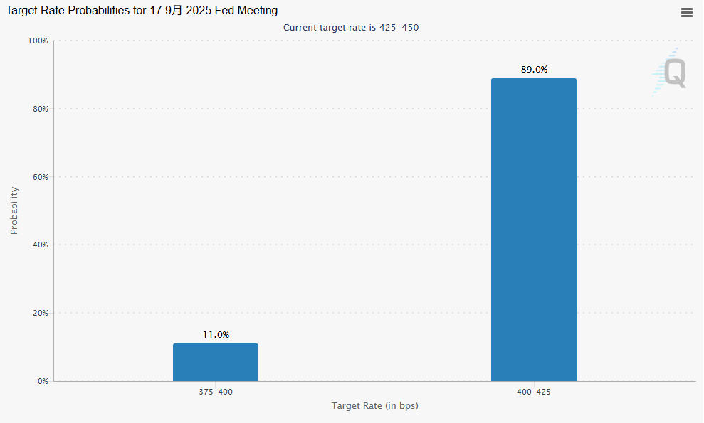 劳动力市场疲软增强了市场对美联储降息的预期。芝商所的“美联储观察”工具显示,市场目前预计9月会议降息25个基点的概率达到89%,而另外的11%是认为会降息50个基点。