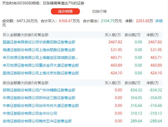 天创时尚今日净买入2263.68万元,买入金额第一为国盛证券有限责任公司宁波桑田路证券营业部,净买入2467.82元,卖出金额第一为招商证券股份有限公司广州华穗路证券营业部,卖出金额为834.32万元。
