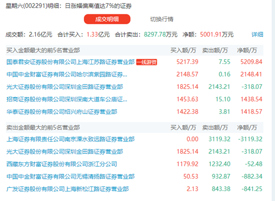 龙虎榜数据显示,星期六今日净买入5001.91万元,买入金额第一为国泰君安证券股份有限公司上海江苏路证券营业部,净买入5209.84元,卖出金额第一为上海证券有限责任公司南京溧水致远路证券营业部,卖出金额为3119.32万元。