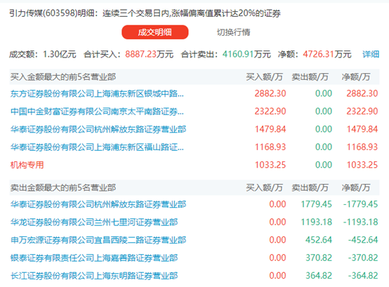 引力传媒今日净买入4726.31万元,买入金额第一为东方证券股份有限公司上海浦东新区银城中路证券营业部,净买入2882.30元,卖出金额第一为华泰证券股份有限公司杭州解放东路证券营业部,卖出金额为1779.45万元。