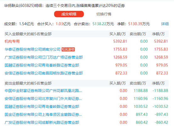 华扬联众今日净买入5130.39万元,买入金额第一为机构,净买入5392.81元,卖出金额第一为中国中金财富证券有限公司广州花都凤凰北路证券营业部,卖出金额为1188.88万元。