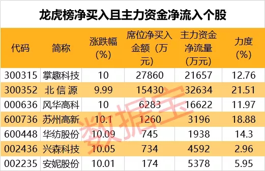 从盘口资金流向来看,主力资金净流入超千万且龙虎榜净买入个股共有7只,其中北信源、掌趣科技、风华高科等个股资金净流入金额最大。净流入力度最大的个股有北信源、苏州高新、华纺股份,净流入力度分别为21.51%、18.88%、14.3%。