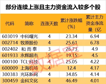 值得注意的是,1794只连续上涨个股中,46只个股期间主力资金累计净流入超过亿元。其中,累计资金流入最多的为中科曙光,主力资金累计流入6.94亿元。