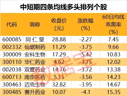 最新数据显示,151只个股5日、10日、20日、60日四条均线近日呈多头排列。其中同仁堂、仙琚制药、安科生物股价与60日均线的乖离率最小,分别为7.45%、9.66%、10.83%。