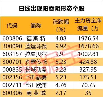 截至最新收盘,两市共有12只个股日K线出现阳吞阴形态,当天涨幅最大的是盛运环保、拉夏贝尔、天翔环境,涨幅分别为9.92%、9.91%、6.28%。