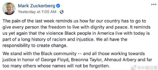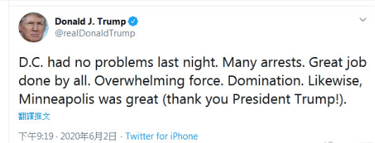 纽约市长白思豪宣布,纽约宵禁令延长至6月7日。而据加州洛杉矶县政府通过社交媒体发布通知,作为全美人口数量最多的县之一,拥有1000万左右人口的洛杉矶县将在当地时间2日晚继续实行宵禁,宵禁时间将从当晚6点一直持续到第二天早上6点,一些城市基本服务工作人员、寻求医疗帮助患者等拥有宵禁豁免权。另外,该县内的一些城市当天将采取更严格的宵禁时间限制。其中,圣莫妮卡的宵禁将从2日当天下午2点一直持续到3日早上5点30分。特朗普更新推特:华盛顿昨晚没出状况,得谢谢特朗普总统!美东时间2日上午,美国总统特朗普发布推特称,“华盛顿特区昨晚没出什么状况。许多人被抓了。所有各方都干得漂亮。(这是)压倒性的力量。控制住了。同样,明尼阿波利斯也做得很棒(这得谢谢特朗普总统!)美国连日爆发示威活动,抗议明尼苏达州非裔男子乔治·弗洛伊德死于白人警察的暴力执法。脸书,推特,耐克,苹果,迪士尼等美国知名企业公开谴责种族歧视。脸书创始人马克•扎克伯格向反种族不平等组织捐赠1000万美元,并在其脸书账号称,“我们与黑人社区站在一起“。推特在其官方账号说明上加入了“黑人的命也是命”的字样,网飞(Netflix)在其官方推特上称,”保持沉默就是同谋”,并承诺有责任保障黑人员工发声。耐克(Nike)在推特上说:“不要假装美国没有问题。不要回避种族主义。不要接受无辜生命被夺走。不要再找借口。不要以为这不会影响到你。不要作壁上观,保持沉默。”周二,欧美乐坛发起黑色星期二运动,抗议美国明尼苏达州白人警察暴力执法导致非洲裔男子乔治•弗洛伊德死亡。索尼音乐、大西洋唱片等公司暂停业务,众多音乐人与社交媒体用户停止发布娱乐内容,将头像与文字配图改为纯黑色,发声拒绝种族歧视。