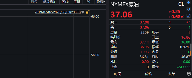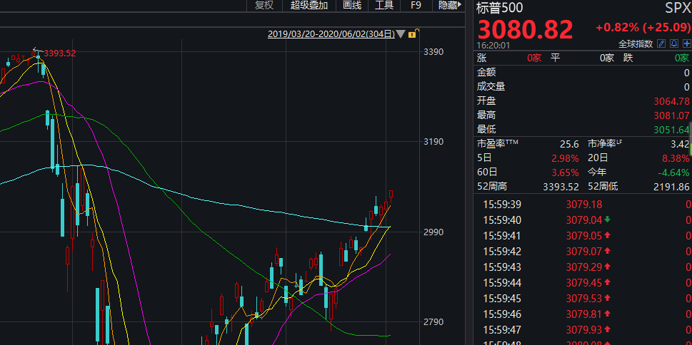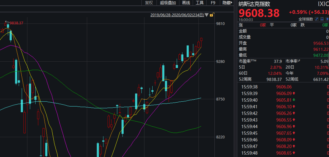 另外,据约翰斯·霍普金斯大学数据,截至美东时间6月2日17时33分,美国累计新冠肺炎确诊病例为1828736例,较昨日增加了逾2.4万例,累计死亡106046例。越来越多州长和公共卫生专家担心,美抗议活动或致新一轮新冠疫情高峰。多位美国卫生专家担忧,抗议活动中人群密集,许多人不戴口罩,还有人高喊口号或大声喊叫。周二美国三大股指收涨,标普500指数创3月4日以来新高。道指收涨逾260点,纳指涨0.59%,距离历史最高点9838点仅230点。标普500指数涨0.82%。陶氏涨超5%,领涨道指。苹果涨0.46%,特斯拉跌1.8%。蒂芙尼收跌约9%,传该公司与路威酩轩的收购交易不明朗。中概股多数上涨,瑞幸咖啡涨14.2%,嘉楠科技涨17.5%。美国大型科技股集体上涨,苹果涨0.46%,亚马逊涨0.06%,奈飞涨0.33%,谷歌涨0.52%,Facebook涨0.35%,微软涨1.14%。热门中概股多数收涨,阿里巴巴涨3.81%,京东涨1.63%,百度涨0.12%;美美证券涨32.56%,蘑菇街涨28.46%,如涵涨21.33%,嘉楠科技涨17.45%,瑞幸咖啡涨14.22%,跟谁学涨13.4%,人人网涨13.4%,蔚来汽车涨9.86%,拼多多涨2.34%;无忧英语跌7.82%。摩根大通认为美股上涨才刚刚起步。据其计算,目前全球非银投资者的股票配置比例为40%,尽管自3月23日以来全球股市已大幅上涨,但仍处于后雷曼时代的低点。更重要的是,不仅当前40%的股票配置低于历史平均水平,也远低于2018年初49%的高点。另外,周二国际油价集体走高,NYMEX原油期货收涨4.03%报36.87美元/桶,连涨四日,创3月6日以来新高,今日早间开盘继续上涨。布油涨3.39%报39.62美元/桶。美国上周API原油库存意外减少。