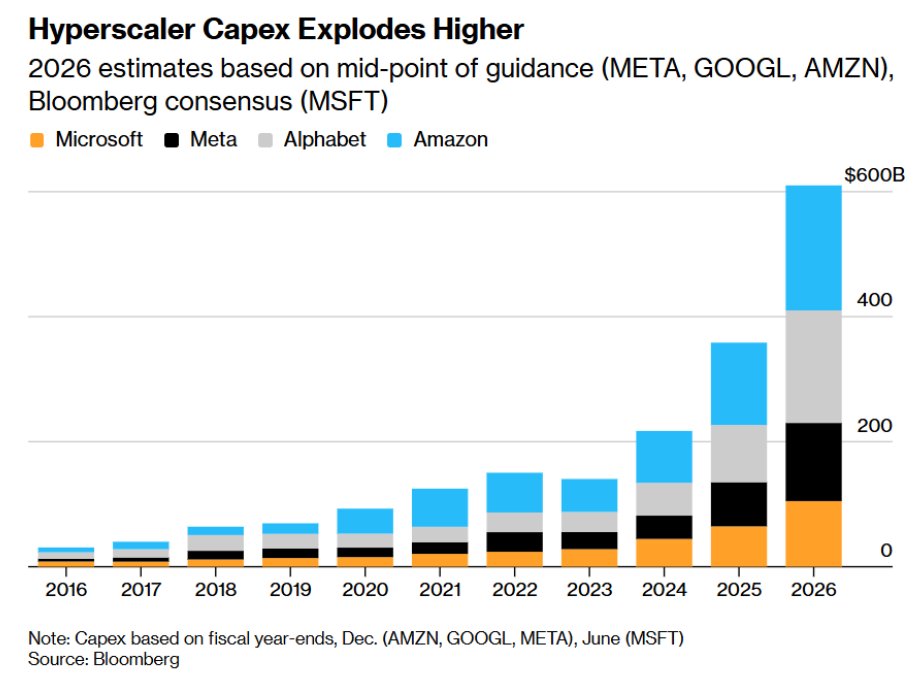 根据机构汇编的最新分析师预期,亚马逊连同谷歌母公司Alphabet、Facebook母公司Meta Platforms Inc.,以及甲骨文公司和微软,预计将在2026年的累计人工智能相关资本支出达到大约6500亿美元,还有一些分析师认为整体支出可能超过7000亿美元——意味着同比AI资本开支增幅可能超过70%。值得注意的是,上述的这五大美国超级科技巨头,预计将在2023年至2026年间,为打造无比庞大的AI算力基础设施累计投入约1.5万亿美元;相比之下,这些科技巨头们在2022年之前的整个历史统计期间累计投资约6000亿美元。