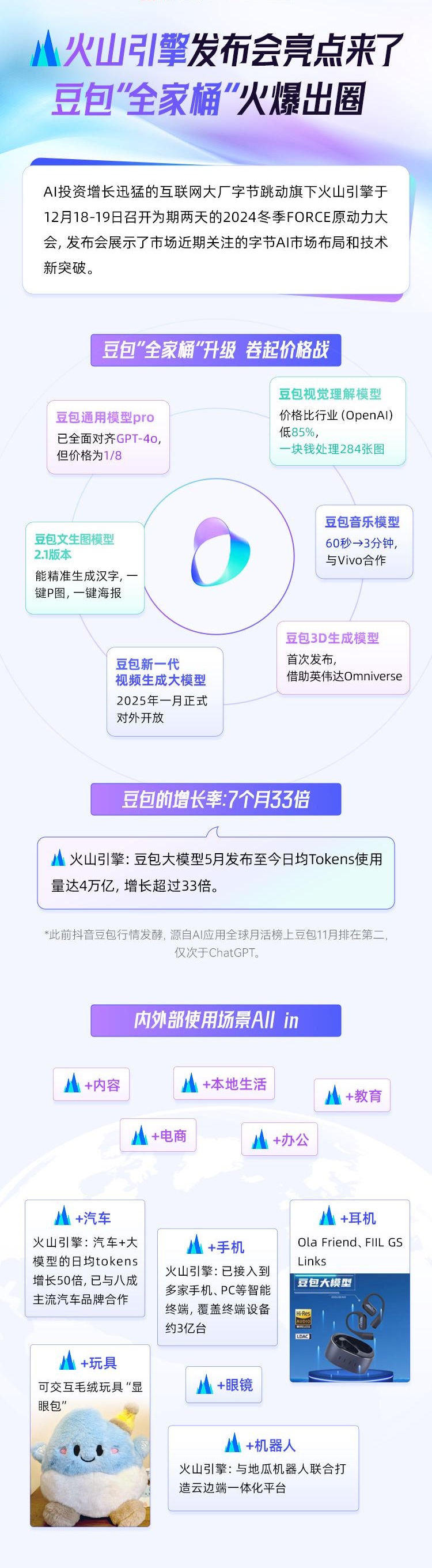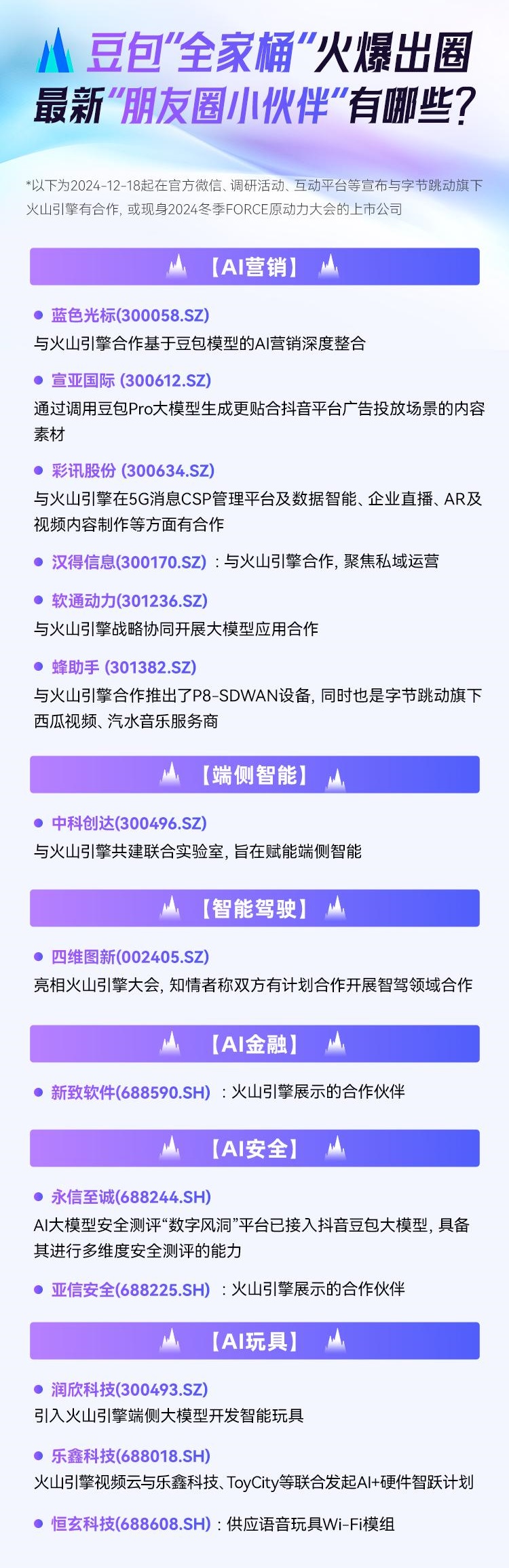 互联网大厂字节跳动旗下火山引擎于12月18-19日召开了为期两天的2024冬季FORCE原动力大会,发布会展示了资本市场近期关注的字节AI市场布局,以及技术新突破。以豆包大模型为代表的产品火爆出圈,其最新“朋友圈”中亦包含数家A股上市公司。