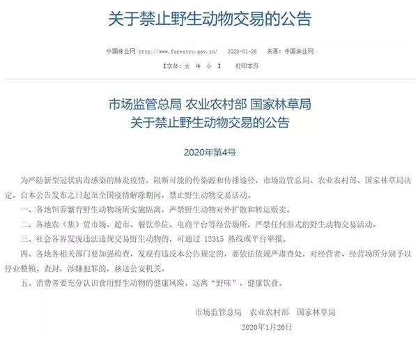 1月26日,为严防新型冠状病毒感染的肺炎疫情,阻断可能的传染源和传播途径,市场监管总局、农业农村部、国家林草局决定,即日起至全国疫情解除期间,禁止野生动物交易活动。各地饲养繁育野生动物场所实施隔离,严禁野生动物对外扩散和转运贩卖;各地农(集)贸市场、超市、餐饮单位、电商平台等经营场所,严禁任何形式的野生动物交易活动。