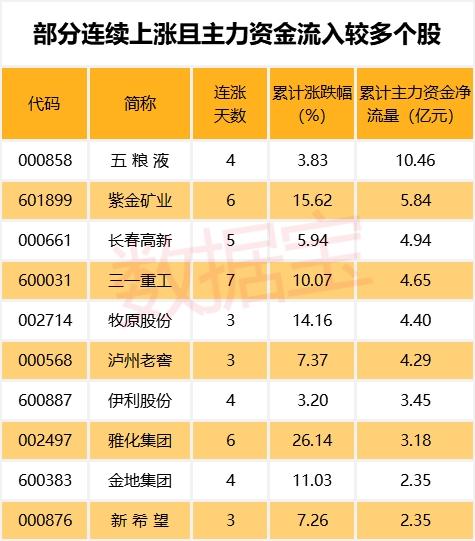 值得注意的是,317只连续上涨个股中,28只个股期间主力资金累计净流入超过亿元。其中,累计资金流入最多的为五粮液,主力资金累计流入10.46亿元。