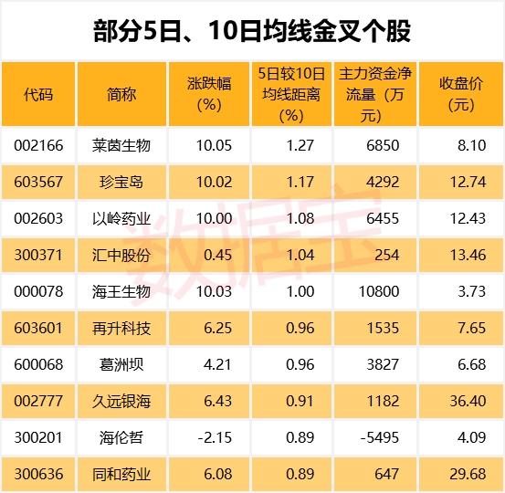 从个股数据来看,有386只A股的5日均线主动上穿10日均线,其中莱茵生物、珍宝岛、以岭药业等个股的5日均线较10日均线距离最大,分别达1.27%、1.17%、1.08%。