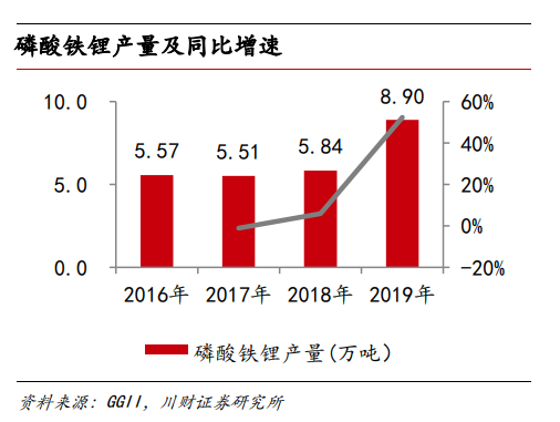 川财证券报告显示,2019年我国磷酸铁锂产量8.9万吨,同比增速52.4%。