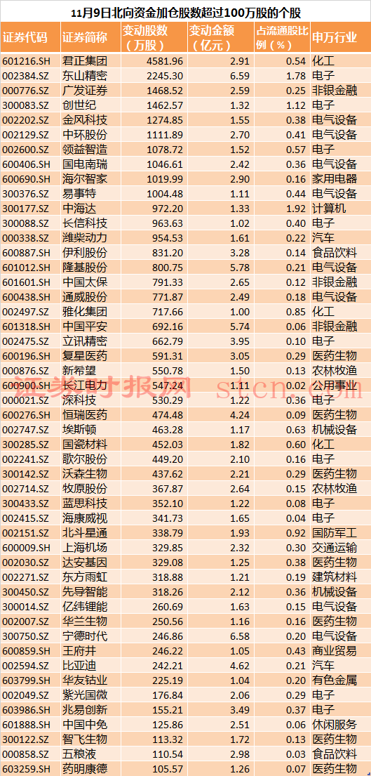 从加仓股数来看,科技行业仍是主要增持对象,东山精密、创世纪、金风科技、中环股份、领益制造等多股获北向资金加仓超过1000万股。