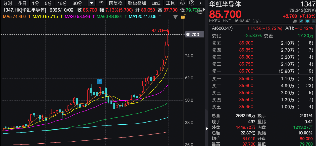 其中,行业龙头中芯国际高开高走,全天大涨12.7%,最终报收于89.65港元/股,创历史新高,单日市值增加超200亿港元。同时,华虹半导体大涨7.13%,报收85.7港元/股,同样创下历史新高。据悉,华虹半导体受益于Fab9产能爬坡及AI服务器电源管理芯片需求激增。