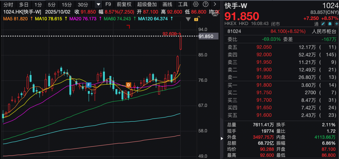 科网股集体走高,快手-W表现亮眼,收盘大涨8.57%,盘中股价突破92港元/股,创下近三年来新高。