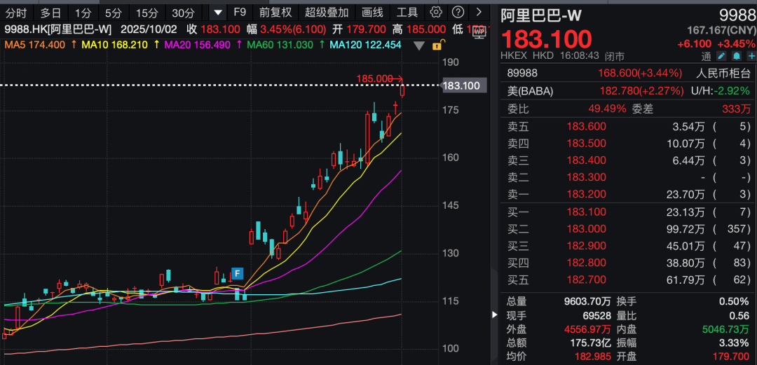 此外,阿里巴巴-W收涨3.45%,股价突破183港元/股,创下2021年8月以来新高。近期,多家券商研报对阿里巴巴-W表达看好预期,并上调其目标价。
