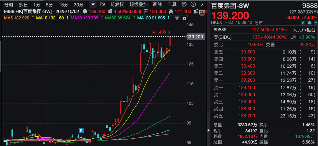 此外,百度集团-SW上涨4.5%,股价创2023年9月以来新高,为139.2港元/股。国泰海通研报称,百度依托自研AI模型,加强赋能多项业务,深度思考模型文心X1.1在多项指标上显著提升,基准测试整体效果已与GPT-5、Gemini2.5Pro看齐。同时,该券商研报上调百度集团2025年-2027年收入预测为1307亿元、1385亿元及1492亿元,经调整净利润为176亿元、202亿元及298亿元。