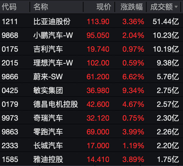港股汽车板块普涨,蔚来-SW、零跑汽车、小鹏汽车-W等新势力汽车股领涨,分别上涨6.62%、3.99%和2.04%。