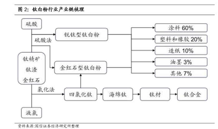 钛白粉生产的上游为钛矿开采企业和硫酸生产企业,下游中涂料、塑料和造纸三大下游行业分别约占60%、20%和10%,其市场需求变动与国民经济发展及房地产市场景气度高度相关。