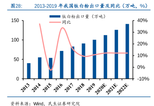 近年来国内钛白粉企业竞争力不断增强,钛白粉出口量持 续增长,钛白粉出口量从 2011 年的 39.81 万吨增加到 2019 年的 100.70 万吨,复合增 长率为 12.30%。