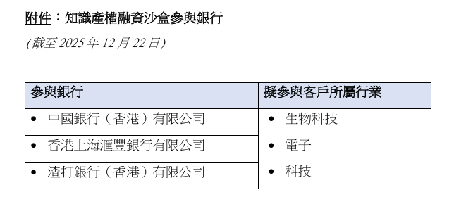 12月22日,香港金融管理局(金管局)联同商务及经济发展局(商经局)及知识产权署推出知识产权融资沙盒。香港三家主要银行已经加入沙盒成为首批参与者,并确认有来自生物科技、电子及科技行业的客户对透过沙盒测试知识产权融资交易感兴趣。