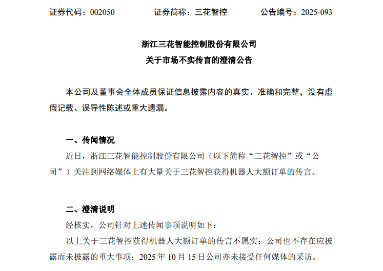 10月15日深夜,三花智控(002050)发布《关于市场不实传言的澄清公告》。公告称,三花智控关注到网络媒体上有大量关于公司获得机器人大额订单的传言。经核实,上述传言不属实;公司不存在应披露而未披露的重大事项。此外,公司还强调,其在10月15日没有接受任何媒体的采访。