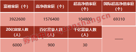具体来看,除港澳台之外,中国大陆富裕家庭数量达到392万户,同比增长1.3%;高净值家庭数量达到158万户,同比减少1.8%;超高净值家庭数量达到10.5万户,同比减少5.1%;国际超高净值家庭数量达到6.9万户,同比减少6%。可以看出,国内高净值家庭整体数量均有减少。