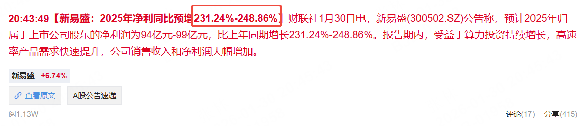 1月30日,新易盛公告称,预计2025年归属于上市公司股东的净利润为94亿元-99亿元,比上年同期增长231.24%-248.86%。报告期内,受益于算力投资持续增长,高速率产品需求快速提升,公司销售收入和净利润大幅增加。