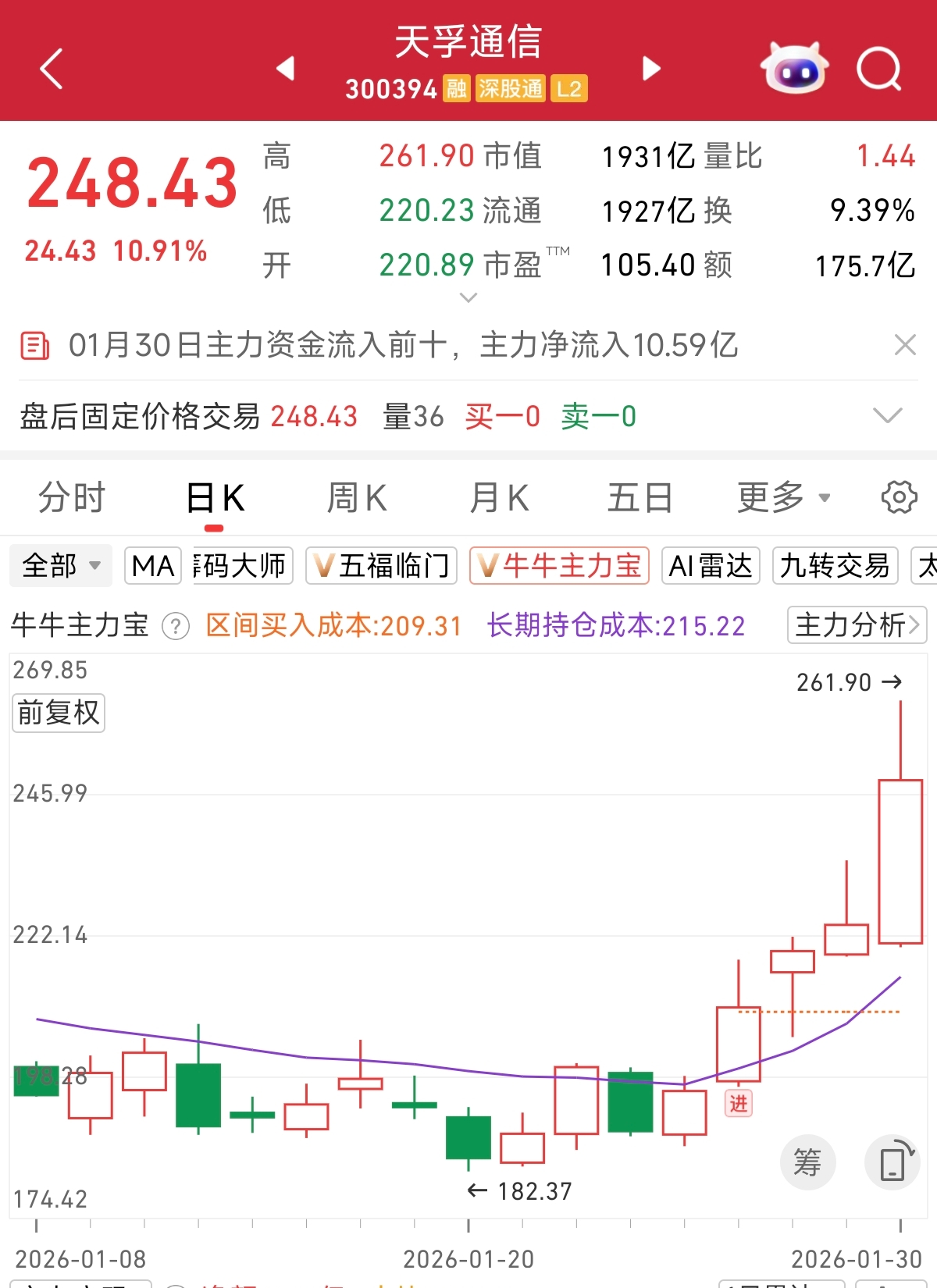 根据“主力宝”监控,今日大涨的天孚通信,1月27日出现了主力进场信号。