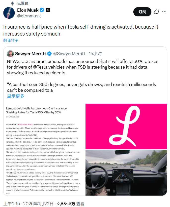 听闻此事,世界首富马斯克也在自己的社交媒体上置顶转发了这个消息,并强调保费下降的原因是自动驾驶系统极大地提升了安全性。帖子下面,特斯拉车主也纷纷留言,询问特斯拉自家的保险何时能因“FSD更加安全”加大折扣力度。