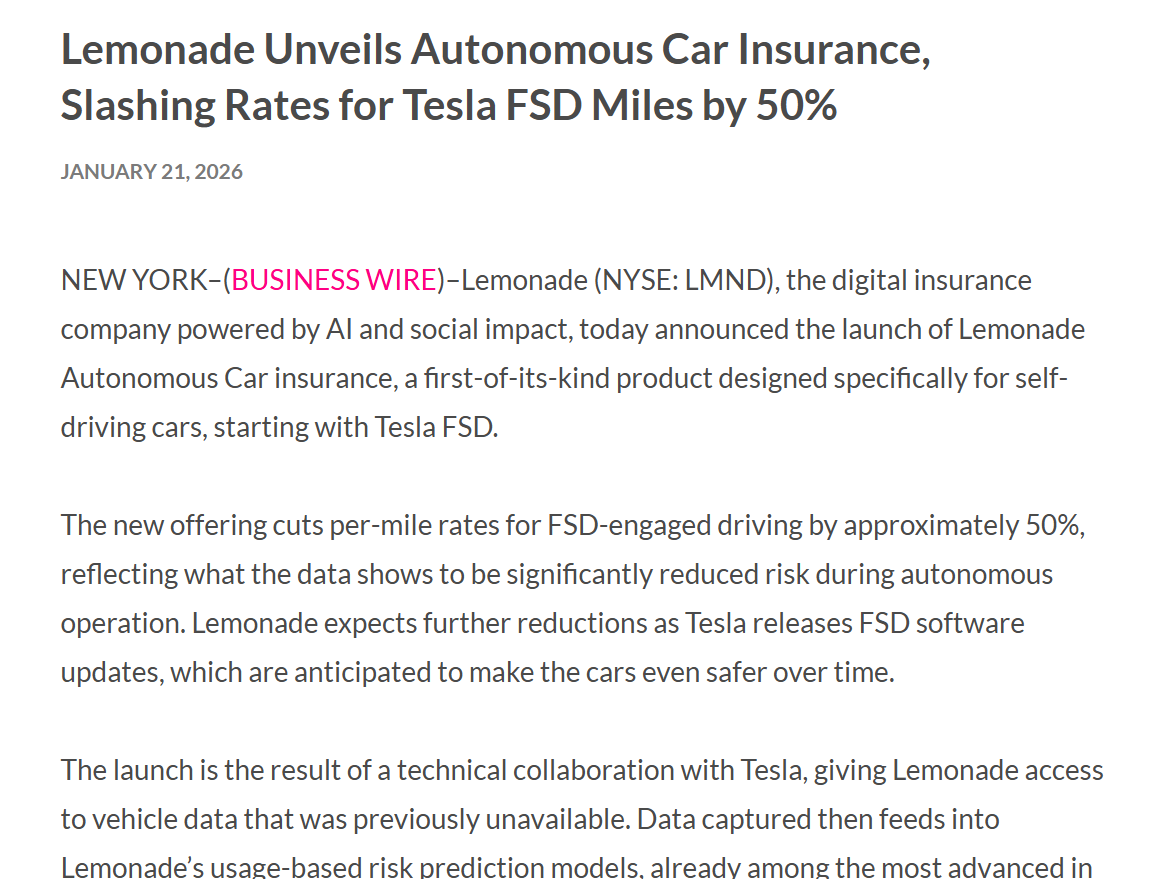 具体来说,Lemonade提供的车险包含基础费用和按驾驶里程计费的两部分,这次打折的是特斯拉车主在启用FSD之后的驾驶里程保费。特斯拉的自有保险产品也对拥有FSD并在至少一半行驶里程中使用该功能的车主打折,但幅度只有10%。