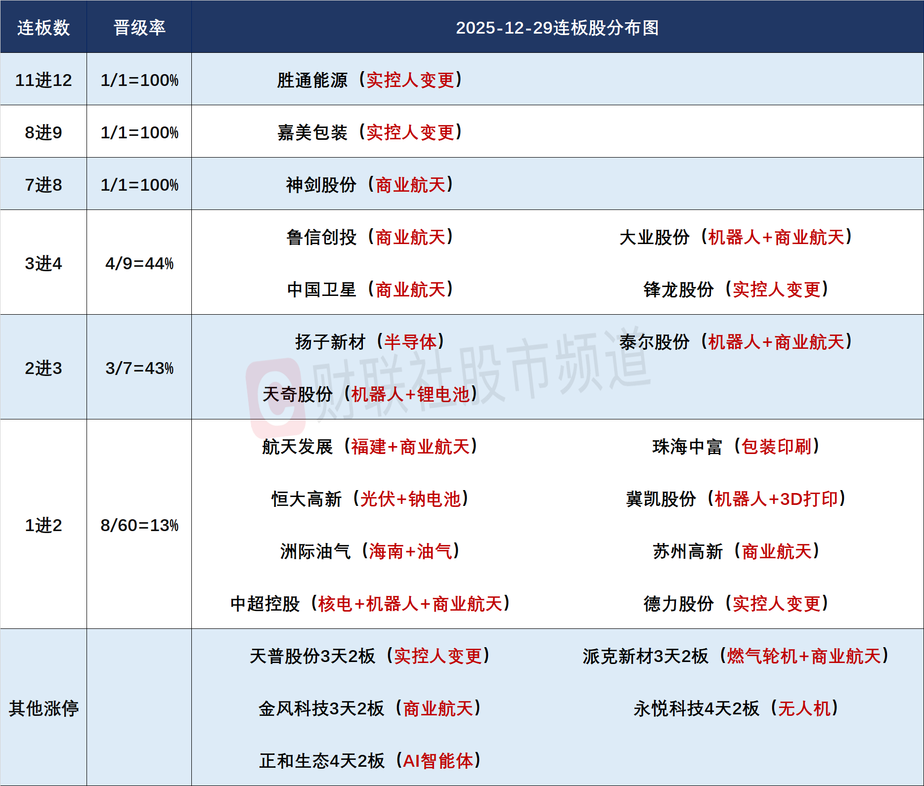板块方面,商业航天概念继续爆发,权重中国卫星走出4连板创历史新高,总市值突破1000亿。此外,神剑股份8连板,大业股份、鲁信创投4连板,泰尔股份3连板,人气股航天发展再度走出2连板,参股蓝箭航天的金风科技3天2板;机器人概念延续强势,优必选产业链的锋龙股份4连板,天奇股份3连板,恒勃股份、步科股份、瑞松科技20CM涨停,消息面上,工信部人形机器人与具身智能标准化技术委员会成立会议日前在京召开,标委会主要承担人形机器人与具身智能基础共性、关键技术等领域行业标准制修订工作。