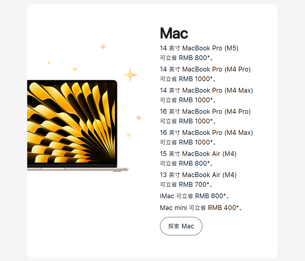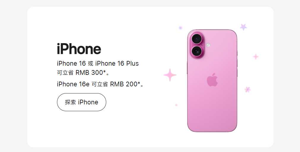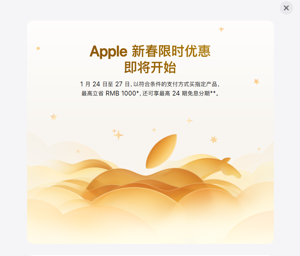 苹果中国官网最新上线新春限时优惠活动,用户于2026年1月24日0时1分至1月27日23时59分以符合条件的支付方式购买iPhone、Mac、iPad和Apple Watch等指定产品最高立省1000元。但最新发布的iPhone 17系列手机产品不在降价范围内。